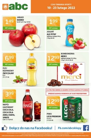 {loadposition linkABC} Nowa gazetka promocyjna sieci sklepów ABC. Polecane promocje z gazetki ABC: Jabłka Idared 1 kg - 1,49 zł. Jogurt Ale Pitny Danone 290 g - 1,99 zł. Bombonierka Merci 210 g - 12,99 zł. Oferta…