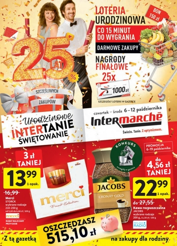 {loadposition linkIntermarche2} '25 lat szczęśliwych zakupów' - nowa gazetka promocyjna sieci sklepów Intermarche Polecane promocje z gazetki Intermarche: Merci 220-250 g - 13,99 zł. Kawa rozpuszczalna Jacobs Cronat Gold 220 g - 22,99 zł. Nuggetsy Drosed 225 g -…