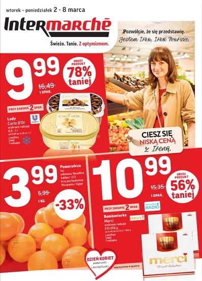 {loadposition linkIntermarche} 'Ciesz się niską ceną z Ireną' - nowa gazetka promocyjna sieci sklepów Intermarche Polecane promocje z gazetki Intermarche: Lody Carte d'Or 900 ml - 9,99 zł. Pomarańcze 1 kg - 3,99 zł. Bombonierka Merci 2x250 g -…