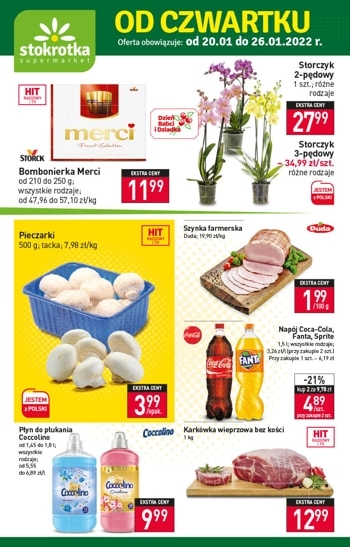 Nowa gazetka promocyjna sieci sklepów Stokrotka. Polecane promocje z gazetki Stokrotka: Bombonierka Merci 250 g - 10,99 zł. Storczyk dwupędowy - 17,99 zł. Obiadowa ćwiartka z kurczaka 1 kg - 2,99 zł. Oferta ważna od czwartku 21.01…