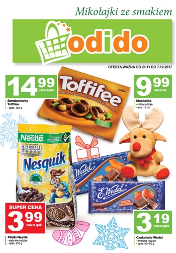 Nowa gazetka promocyjna sklepów Odido - "Mikołajki ze smakiem". Polecane promocje z gazetki Odido: Bombonierka Toffifee 250 g - 14,99 zł. Płatki Nestle 250 g - 3,99 zł. Maskotka wys.12 cm - 9,99 zł. …