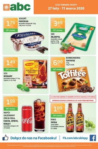 {loadposition linkABC} Nowa gazetka promocyjna sieci sklepów ABC. Polecane promocje z gazetki ABC: Ser w plastrach Mlekpol 150 g - 3,49 zł. Sos Winiary wszystkie rodzaje - 1,49 zł. Bombonierka Toffifee 125 g - 6,99 zł.…