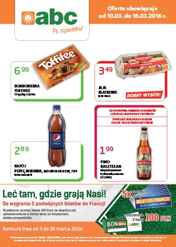 Nowa gazetka promocyjna sklepów ABC. Polecane promocje z gazetki ABC: Bombonierka Toffifee 125 g - 6,99 zł. Jaja klatkowe 10 sztuk - 3,49 zł. Piwo Kasztelan Niepasteryzowane 500 ml - 1,99 zł. Oferta ważna od 10.03 do…