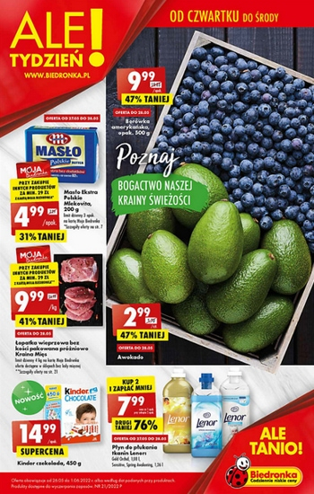 {loadposition linkBiedronka2} 'Ale tydzień!' - nowa gazetka promocyjna sieci sklepów Biedronka. Polecane promocje z gazetki sieci Biedronka: Borówka amerykańska 500 g - 9,99 zł*. Awokado 1 sztuka - 2,99 zł**. Kinder czekolada 450 g - 14,99 zł. *…