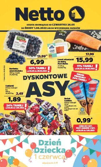 {loadposition linkNetto} 'Dyskontowe asy' - nowa gazetka promocyjna sieci sklepów Netto. Polecane promocje z gazetki Netto: Borówka amerykańska 300 g - 6,99 zł*. Cukierki 100 g - 1,89 zł. Lody rożek Coldino 2x120 ml - 1,98 zł. *…
