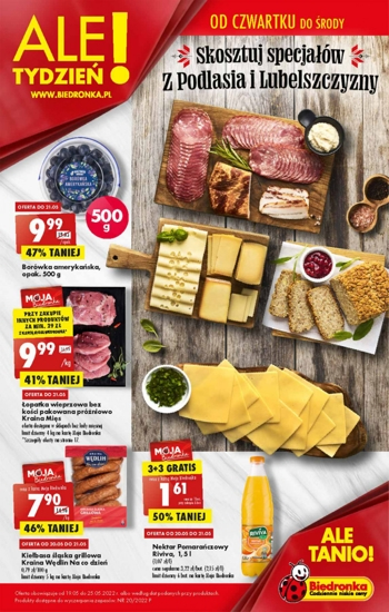 {loadposition linkBiedronka2} 'Ale tydzień!' - nowa gazetka promocyjna sieci sklepów Biedronka. Polecane promocje z gazetki sieci Biedronka: Borówka amerykańska 500 g - 9,99 zł*. Łopatka wieprzowa bez kości pakowana próżniowo Kraina Mięs 1 kg - 9,99 zł**. Kiełbasa śląska…