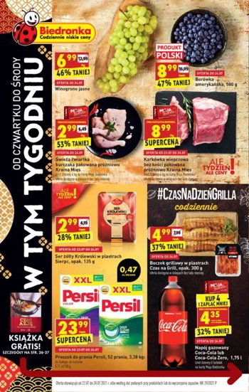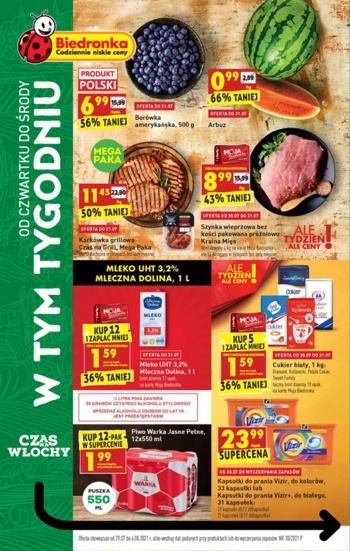 {loadposition linkBiedronka2} 'W tym tygodniu' - nowa gazetka promocyjna sieci sklepów Biedronka. Polecane promocje z gazetki sieci Biedronka: Borówka amerykańska 500 g - 6,99 zł. Arbuz 1 kg - 0,99 zł. Karkówka grillowa Czas na grill Mega Paka 1…