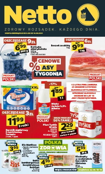 {loadposition linkNetto3} 'Cenowe asy tygodnia' - nowa gazetka promocyjna sieci sklepów Netto. Polecane promocje z gazetki Netto: Borówka amerykańska 500 g - 6,99 zł. Boczek ze skórą 1 kg - 9,99 zł. Piwo Tyskie 8x500 ml - 18,32 zł.…