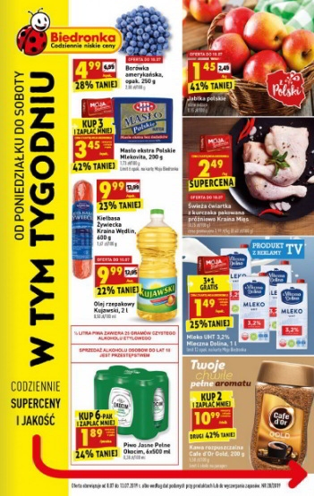 'W tym tygodniu' - nowa gazetka promocyjna sieci sklepów Biedronka. Polecane promocje z gazetki sieci Biedronka: Borówka amerykańska 250 g - 4,99 zł. Polskie jabłka 1 kg - 1,45 zł. Olej rzepakowy Kujawski 2 L - 9,99…