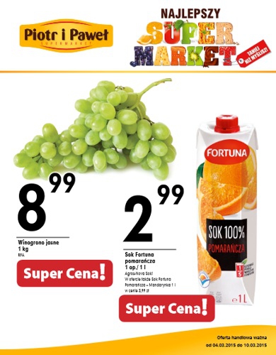 Nowa gazetka promocyjna sieci sklepów Piotr i Paweł. Polecane promocje z gazetki Piotr i Paweł: Winogrono jasne 1 kg - 8,99 zł. Sok pomarańczowy Fortuna 1 L - 2,99 zł. Borówka amerykańska 125 g - 4,99 zł. …