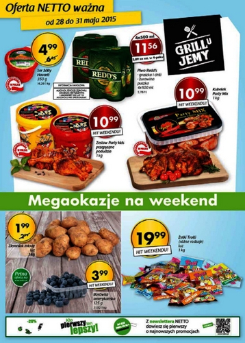 {loadposition linkNetto} Nowa gazetka promocyjna Netto - "Megaokazje na weekand". Polecane promocje z gazetki Netto: Borówka amerykańska 125 g - 3,99 zł. Żelki Trolli 1 kg - 19,99 zł. Ser żółty Havarti 350 g - 4,99 zł. …