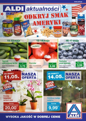 {loadposition linkAldi} Nowa gazetka promocyjna Aldi - "Odkryj smak Ameryki". Polecane promocje z gazetki Aldi: Kwiaty sztuczne w doniczce 1 sztuka - 20 zł. Ozdobna lampa solarna - 9,99 zł. Borówka amerykańska 125 g - 3,99 zł. Oferta…