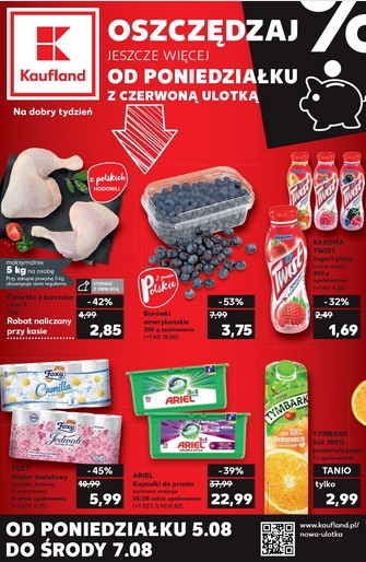{loadposition linkKaufland} 'Oszczędzaj jeszcze więcej od poniedziałku z czerwoną ulotką' - nowa gazetka promocyjna sieci marketów Kaufland. Polecane promocje z gazetki Kaufland: Ćwiartka z kurczaka 1 kg - 2,85 zł. Borówki amerykańskie 250 g - 3,75 zł.…
