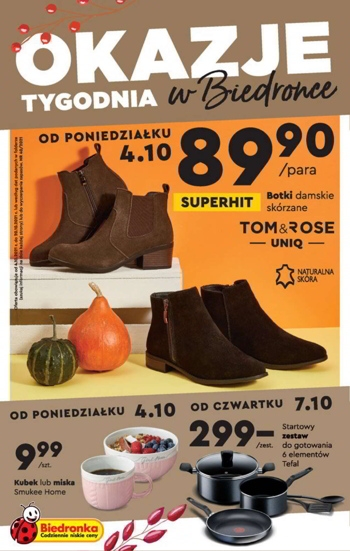 {loadposition linkBiedronka2} 'Okazje tygodnia' - nowa gazetka promocyjna sieci sklepów Biedronka. Polecane promocje z gazetki sieci Biedronka: Botki damskie skórzane Tom&Rose Uniq - 89,90 zł. Kubek lub miska Smukee Home 1 sztuka - 9,99 zł. Startowy zestaw do gotowania…