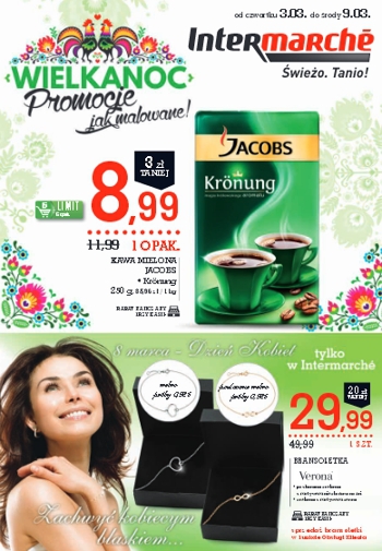 {loadposition linkIntermarche} Nowa gazetka promocyjna sieci handlowej Intermarche - "Wielkanoc. Promocje jak malowane!". Polecane promocje z gazetki Intermarche: Kawa mielona Jacobs Kronung 250 g - 8,99 zł. Bransoletka Verona - 29,99 zł. Czekolada mleczna Baron 80 g - 1,49…