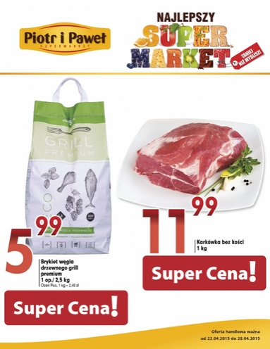 Nowa gazetka promocyjna sieci sklepów Piotr i Paweł - "Super cena!". Polecane promocje z gazetki Piotr i Paweł: Brykiet węgla drzewnego grill premium 2,5 kg - 5,99 zł. Karkówka bez kości 1 kg - 11,99 zł. Ser wędzony…
