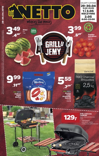 {loadposition linkNetto} Nowa gazetka promocyjna Netto - "Grillujemy". Polecane promocje z gazetki Netto: Grill z pokrywą i półkami - 129 zł. Brykiet węgla drzewnego Dancoal 2,5 kg - 5,55 zł. Kiełbasa śląska Morliny 1 kg - 9,99 zł. …