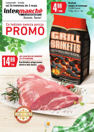 {loadposition linkIntermarche} 'Co tydzień świeża porcja promo' - nowa gazetka promocyjna sieci sklepów Intermarche. Polecane promocje z gazetki Intermarche: Brykiet węgla drzewnego Fire&Flame 2 kg - 4,99 zł. Karkówka wieprzowa ekstra bez kości 1 kg - 14,99 zł.…