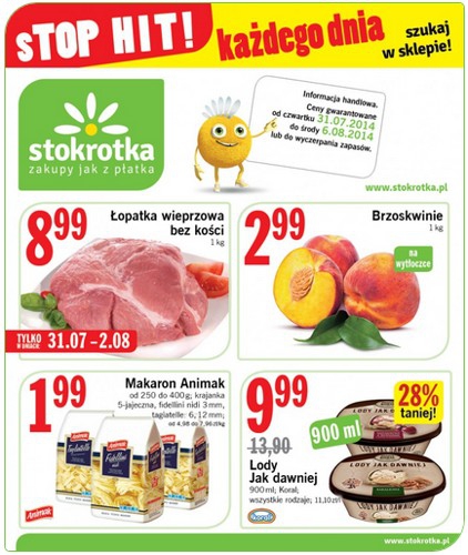 Nowa gazetka promocyjna sieci handlowej Stokrotka - "sTOP HIT!". Polecane promocje z gazetki Stokrotka: Łopatka wieprzowa bez kości 1 kg - 8,99 zł. Brzoskwinie 1 kg - 2,99 zł. Makaron Animak 250-400 g - 1,99 zł. Oferta…