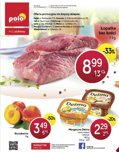 {loadposition linkPoloMarket} Nowa gazetka promocyjna Polo Market - "Życie smakuje lepiej". Polecane promocje z gazetki Polo Market: Łopatka bez kości 1 kg - 8,99 zł. Margaryna Delma 450 g - 2,29 zł. Brzoskwinie 1 kg - 3,49 zł. …