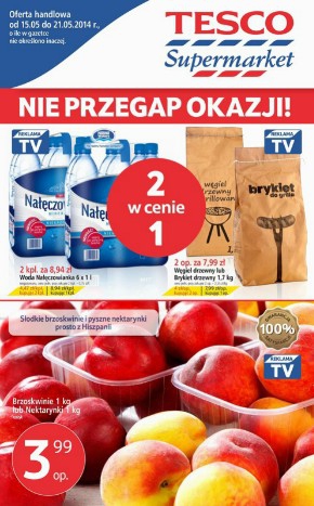 Nowa gazetka promocyjna Tesco - "Nie przegap okazji!". Polecane promocje z gazetki Tesco: Woda Nałęczowianka 12x1 L- 8,94 zł. Węgiel drzewny lub brykiet drzewny 2x1,7 kg - 7,99 zł. Brzoskwinie lub nektarynki 1 kg - 3,99 zł. …