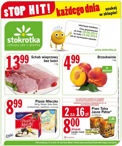 Nowa gazetka promocyjna sieci handlowej Stokrotka - "sTOP HIT!". Polecane promocje z gazetki Stokrotka: Schab wieprzowy bez kości 1 kg - 13,99 zł. Brzoskwinie 1 kg - 4,99 zł. Ptasie Mleczko Wedel 380 g - 8,99 zł. …