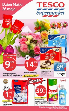 Nowa gazetka promocyjna Tesco. Polecane promocje z gazetki Tesco: Róża pojedyncza z nadrukiem na płatkach - 9,99 zł. Bukiet dla mamy - 14,99 zł. Cukier Tesco 1 kg - 1,98 zł. Zobacz również: Produkty Tesco na grilla…