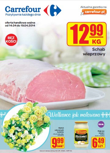 {loadposition linkCarrefour} Nowa gazetka promocyjna sieci handlowej Carrefour - "Wielkanoc jak malowana". Polecane promocje z gazetki Carrefour: Schab wieprzowy bez kości 1 kg - 12,99 zł. Bukiet sztucznych kwiatów - 9,99 zł. Majonez Winiary 700 ml - 6,49 zł.…