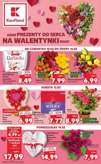 {loadposition linkKaufland} 'Gdzie prezenty od serca na Walentynki mam?' - nowa gazetka promocyjna sieci marketów Kaufland. Polecane promocje z gazetki Kaufland: Praliny kokosowe Raffaello 150 g - 8,49 zł. Bukiet róż 7 sztuk 30 cm - 7,99 zł. Bukiet…