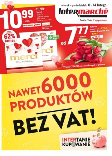 {loadposition linkIntermarche2} 'Intertanie kupowanie. Nawet 6000 produktów bez VAT!' - nowa gazetka promocyjna sieci sklepów Intermarche Polecane promocje z gazetki Intermarche: Bombonierka Merci 2x210 g - 21,98 zł. Bukiet tulipanów 7 sztuk - od 7,77 zł. Delicje Szampańskie 147…