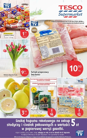 Nowa gazetka promocyjna Tesco. Polecane promocje z gazetki Tesco: Schab wieprzowy bez kości 1 kg - 10,99 zł. Bukiet tulipanów 9 sztuk - 9,99 zł. Piwo Żubr 8x500 ml - 16 zł. Oferta ważna od 21.01 do…