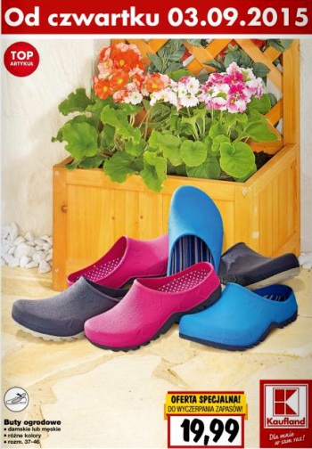 {loadposition linkKaufland} Nowa gazetka promocyjna marketu Kaufland - "TOP-Artykuł". Polecane promocje z gazetki Kaufland: Buty ogrodowe - 19,99 zł. Termokompostownik - 69,99 zł. Miotła do liści teleskopowa - 11,99 zł. Oferta ważna od 3.09 do wyczerpania zapasów.