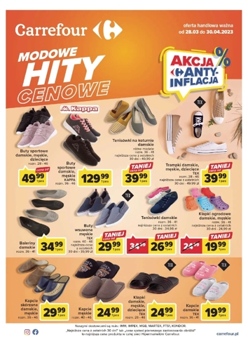 {loadposition linkCarrefour4} 'Modowe hity cenowe' - nowa gazetka promocyjna sieci marketów Carrefour. Polecane promocje z gazetki Carrefour: Buty sportowe damskie, męskie lub dziecięce - 49,99 zł. Tenisówki damskie na koturnie - 39,99 zł. Buty męskie wsuwane TEX - 29,99…