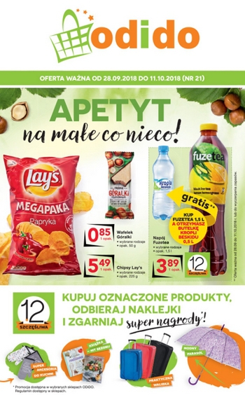 'Apetyt na małe co nieco!' - nowa gazetka promocyjna sklepów Odido. Polecane promocje z gazetki Odido: Chipsy Lay's 225 g - 5,49 zł. Wafelek Góralki 50 g - 0,85 zł. Napój Fuzetea 1,5 L - 3,89 zł*. …