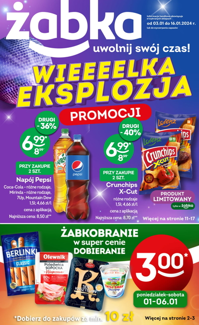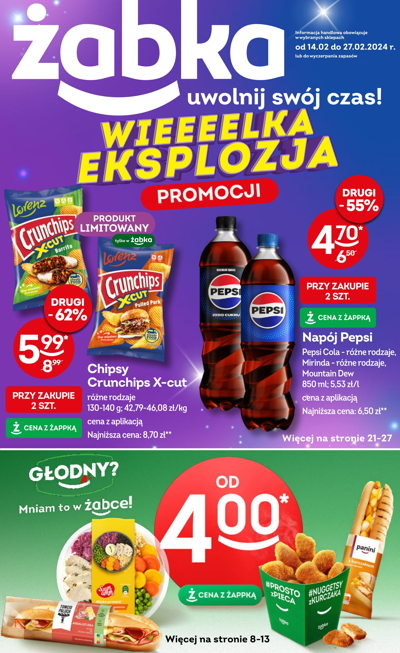 'Wieeeelka eksplozja promocji' - nowa gazetka promocyjna sieci sklepów Żabka. Polecane promocje z gazetki Żabka: Pepsi, Mirinda lub 7Up 1,5 L - 6,99 zł*. Chipsy Crunchips różne rodzaje - 6,99 zł*. Piwo Paderborner 330 ml - 2,99 zł*. …
