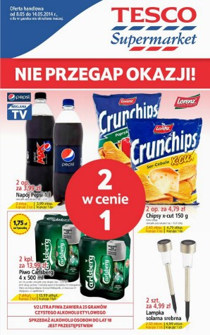 Nowa gazetka promocyjna Tesco - "Nie przegap okazji!". Polecane promocje z gazetki Tesco: Pepsi 2x1 L - 3,99 zł. Chipsy Crunchips x-cut 2x150 g - 4,79 zł. Piwo Carlsberg 8x500 ml - 13,99 zł. Oferta ważna od…