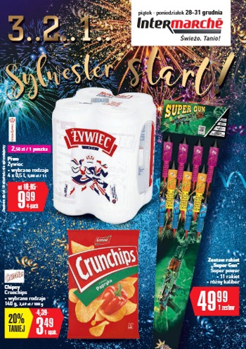 {loadposition linkIntermarche} '3..2..1.. Sylwester start!' - nowa gazetka promocyjna sieci sklepów Intermarche Polecane promocje z gazetki Intermarche: Piwo Żywiec 4x500 ml - 9,99 zł. Chipsy Crunchips 140 g - 3,49 zł. Zestaw rakiet Super Gun - 49,99…