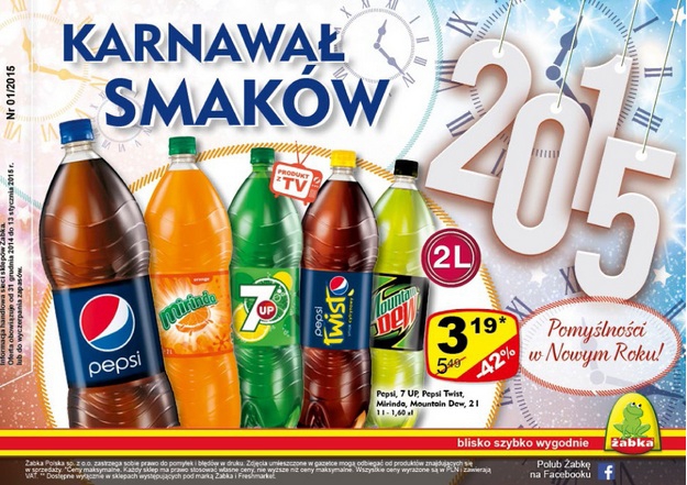 Nowa gazetka promocyjna sieci sklepów Żabka - "Karnawał smaków". Polecane promocje z gazetki Żabka: Pepsi, Mirinda, 7Up lub Mountain Dew 2 L - 3,19 zł. Chipsy Crunchips 140 g - 2,99 zł. Napój Oshee Vitamin Shot 250 ml…