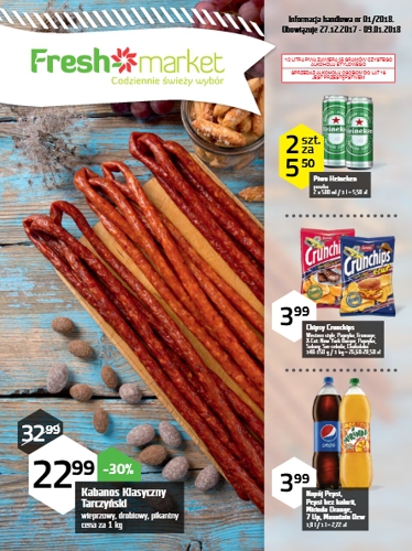 {loadposition linkFreshmarket} Nowa gazetka promocyjna sieci sklepów Freshmarket. Polecane promocje z gazetki Freshmarket: Kabanos klasyczny Tarczyński 1 kg - 22,99 zł. Piwo Heineken 2x500 ml - 5 zł. Chipsy Crunchips 140 g - 3,99 zł. …
