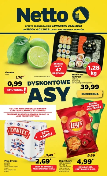 {loadposition linkNetto5} 'Dyskontowe asy' - nowa gazetka promocyjna sieci sklepów Netto. Polecane promocje z gazetki Netto: Limonka 1 sztuka - 0,99 zł. Sushi 4You Party Set 1,28 kg - 39,99 zł. Chipsy Lay's różne rodzaje - 4,99 zł*. …
