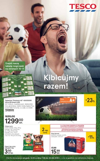 'Kibicujmy razem!' - nowa gazetka promocyjna sieci sklepów Tesco. Polecane promocje z gazetki Tesco: Telewizor 4K Ultra HD 43 cale Thomson 43UC6306 - 1299 zł. Chipsy Lay's 2x140 g - 7 zł. Piwo Harnaś 8x550 ml -…