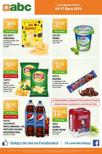 {loadposition linkABC} Nowa gazetka promocyjna sieci sklepów ABC. Polecane promocje z gazetki ABC: Ser żółty Serenada 135 g - 3,89 zł. Jogurt naturalny Zott Primo 370 g - 2,39 zł. Chipsy Lay's 2x70 g - 5 zł. …