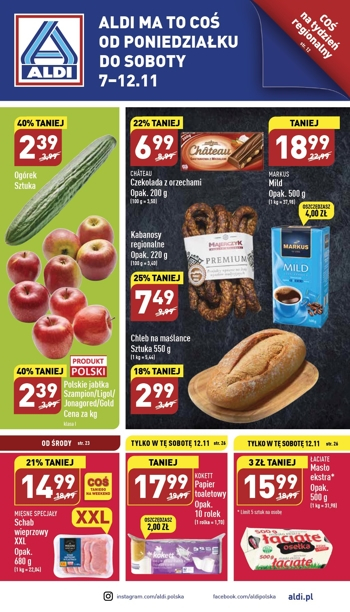 {loadposition linkAldi} 'Aldi ma to coś od poniedziałku do soboty' - nowa gazetka promocyjna sieci sklepów Aldi. Polecane promocje z gazetki Aldi: Ogórek 1 sztuka - 2,39 zł. Polskie jabłka 1 kg - 2,39 zł. Chleb na maślance 550…