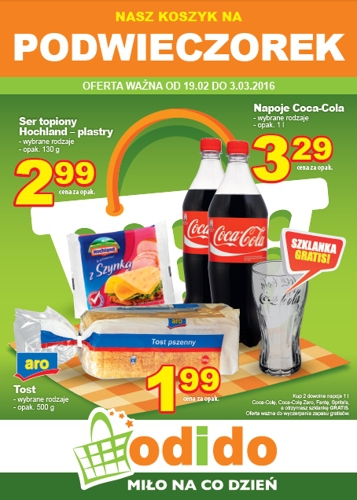 Nowa gazetka promocyjna sklepów Odido - "Nasz koszyk na podwieczorek". Polecane promocje z gazetki Odido: Ser topiony plastry Hochland 130 g - 2,99 zł. Coca-Cola 1 L + szklanka - 3,29 zł. Chleb tostowy 500 g - 1,99…