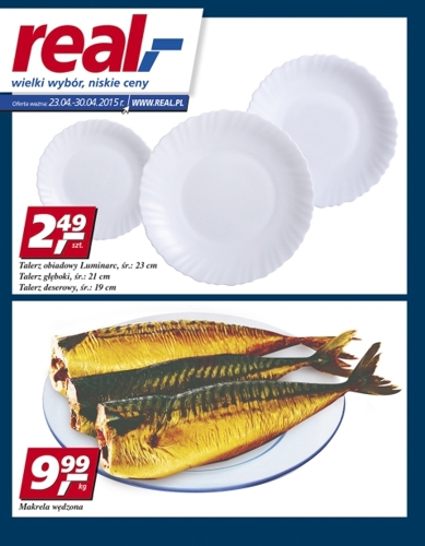 Nowa gazetka promocyjna sieci handlowej Real. Polecane promocje z gazetki Real: Talerz obiadowy Luminarc śr. 23 cm - 2,49 zł. Makrela wędzona 1 kg - 9,99 zł. Chleb 360 g - 0,89 zł. Oferta ważna od 23.04…