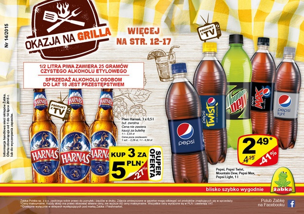 Nowa gazetka promocyjna sieci sklepów Żabka - "Za to lato!". Polecane promocje z gazetki Żabka: Piwo Żubr 3x500 ml - 5,50 zł. Piwo Tyskie 3x500 ml - 6 zł. Chleb żytni ze słonecznikiem Schulstad 430 g - 1,99…
