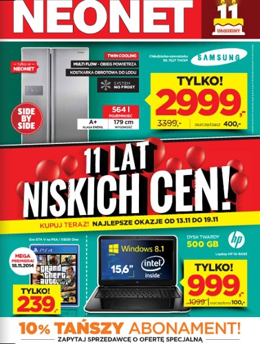 {loadposition linkNeonet} Nowa gazetka promocyjna Neonet - "11 lat niskich cen!". Polecane promocje z gazetki Neonet: Chłodziarko-zamrażarka SAMSUNG RS 7527 THCSP - 2999 zł. Laptop HP 15-R093 - 999 zł. Gra GTA V na PS4 / XBOX One -…