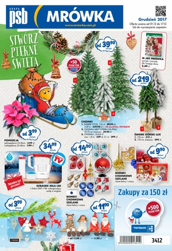 Nowa gazetka promocyjna PSB Mrówka - "Stwóz piękne święta". Polecane promocje z gazetki PSB Mrówka: Choinka mini tundra na pniu - 39,90zł. Świerk górski lux - 219 zł. Dzbanek Mila LED - 34,99 zł. Oferta ważna od…