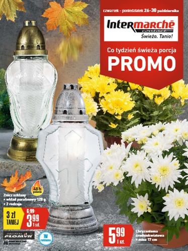 {loadposition linkIntermarche} Nowa gazetka promocyjna sieci handlowej Intermarche. Polecane promocje z gazetki Intermarche: Chryzantema drobnokwiatowa - 7,99 zł. Znicz szklany 100 g 30 h - 2,69 zł. Znicz kapliczka 100 g 35 h - 6,99 zł. Oferta ważna…