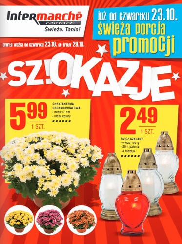 {loadposition linkIntermarche} Nowa gazetka promocyjna sieci handlowej Intermarche. Polecane promocje z gazetki Intermarche: Chryzantema drobnokwiatowa - 7,99 zł. Znicz szklany 100 g 30 h - 2,69 zł. Znicz kapliczka 100 g 35 h - 6,99 zł. Oferta ważna…